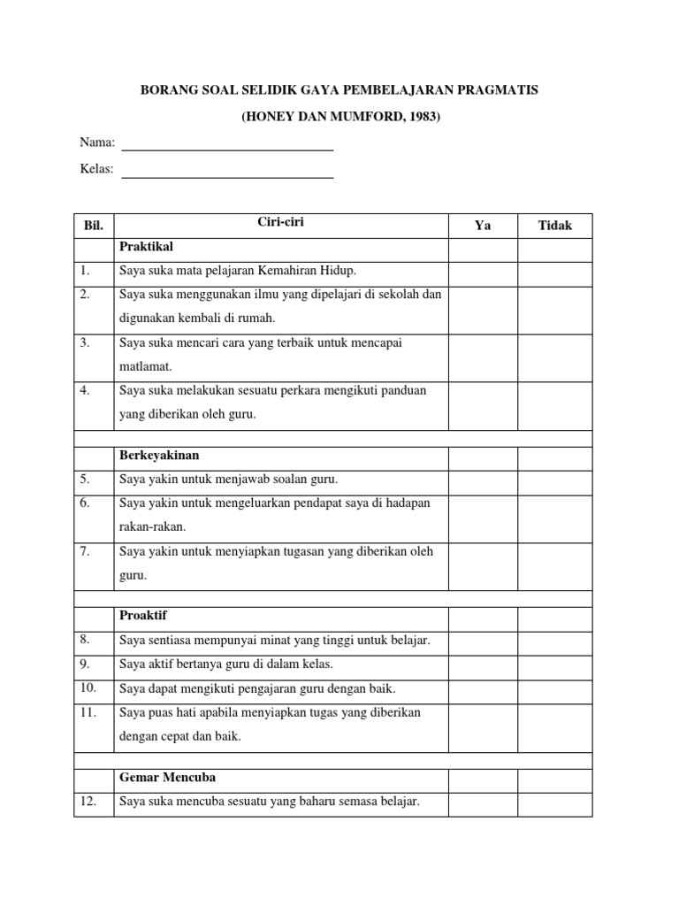 Para pragmatis merespons dengan baik pembelajaran yang dapat diterapkan dengan mudah dan langsung di dunia di sekitar mereka. Misalnya, penjelasan tentang siklus air, sistem pencernaan ataupun sistem pernapasan pada manusia. Model pembelajaran kontekstual dan kooperatif. Gaya pembelajaran 1.0 gaya pembelajaran setiap orang mempunyai gaya pembelajaran dan kekuatan yang tersendiri (kenneth & dunn, 1984). Cara kerja manusia ditentukan oleh dua dimensi yaitu dimensi kualitas berfikir abstrak (ba) dan kualitas. Sebanyak 133 orang pelajar telah terlibat dalam kajian ini. Soal selidik oleh honey dan mumford (1992) telah digunakan dalam proses pengumpulan data. Kamu bisa coba test gaya belajar honey dan mumford dengan mengisi kuisioner yang terdiri dari 80 pertanyaan. Menurut honey dan mumford (1992), gaya pembelajaran didiefinisikan sebagai penerangan ke atas sikap dan tingkah laku individu yang mengamalkannya. Gregorc (1979) mentakrifkaan gaya pembelajaran sebagai tingkah laku yang dimanifestasikan oleh seseorang individu apabila menggunakan mindanya berinteraksi dengan persekitaran, kemudian mengumpul dan memproses maklumat daripadanya. Hasil dapatan kajian menunjukkan gaya pembelajaran yang menjadi keutamaan bagi kumpulan responden ini ialah reflektor dan diikuti aktivis. · model gaya pembelajaran honey dan mumford. Gaya pembelajaran kendiri pengenalan pengenalan gaya pembelajaran merupakan pendekatan atau cara bagaimana seseorang itu belajar dalam meperolehi pengetahuan.