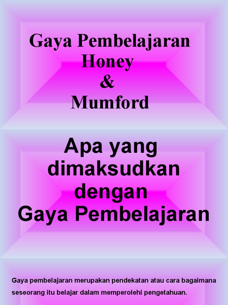 Sebanyak 133 orang pelajar telah terlibat dalam kajian ini. Menurut honey dan mumford (1992), gaya pembelajaran didiefinisikan sebagai penerangan ke atas sikap dan tingkah laku individu yang mengamalkannya. Honey and mumford (1986) learning. Hasil dapatan kajian menunjukkan gaya pembelajaran yang menjadi keutamaan bagi kumpulan responden ini ialah reflektor dan diikuti aktivis. 21 gaya pembelajaran honey dan mumford (1992) honey dan mumford (1992), mengatakan pembelajaran telah berlaku apabila manusia boleh mempamerkan sesuatu yang baru, sama ada dalam bentuk pemahaman, kesedaran atau kemahiran.