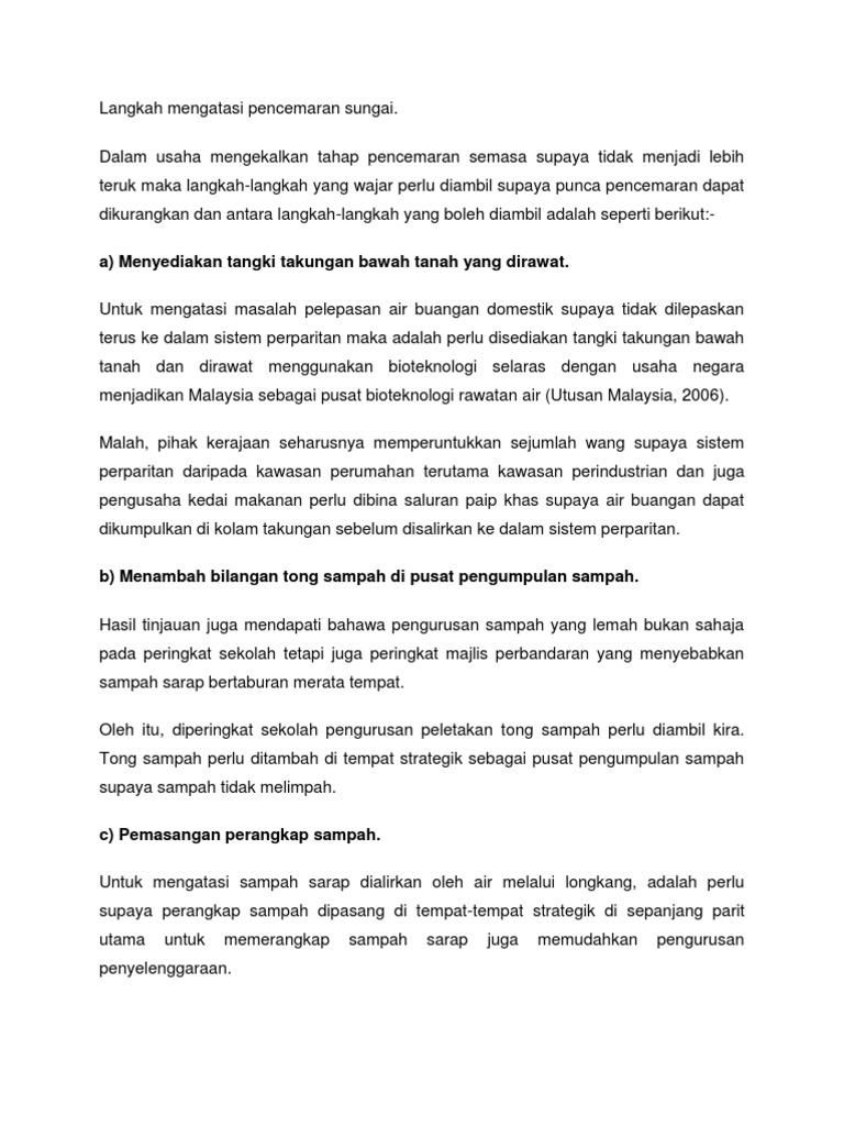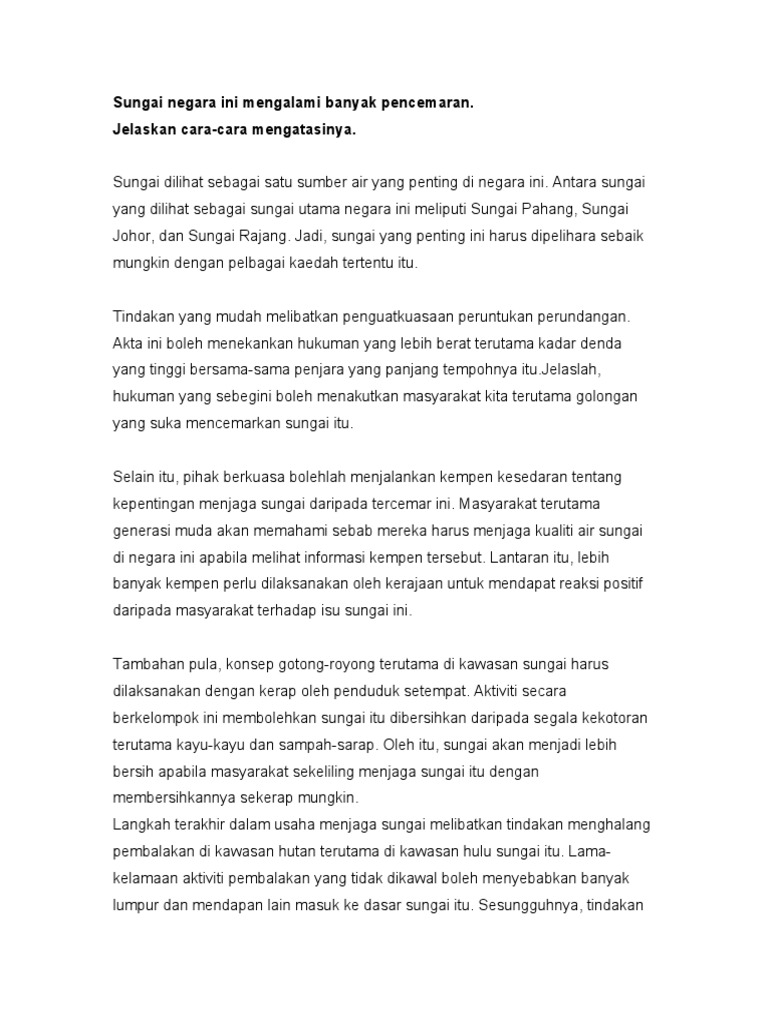 Limbah yang ada, tidak bisa jika langsung di keluarkan ke lingkungan, karena. Pencemaran sungai di banyak wilayah di indonesia telah mengakibatkan terjadinya krisis air bersih. Please fill this form, we will try to respond as soon as possible. Pengertian pencemaran lingkungan beserta penyebab dan dampaknya. A)penubuhan sebuah yayasan atau kelab pencinta sungai perlu dimulakan. Sungai masai yang pada suatu masa dahulu menjadi tempat memancing kegemaran ramai kerana airnya yang jernih dan mengalir deras, kini tercemar, berkeladak, dipenuhi sampah sarap dan. Intervensi manusia terhadap cara alam bekerja seringkali tidak solutif dan malah menyebabkan banyak masalah. Tajuk 7sungai merupakan sumber air minuman tetapi pencemaran sungai di negara kita telah sampai ke tahap yang agak membimbangkan. Kehendak soalan calon hendaklah menghuraikan dua kesan negatif akibat pencemaran sungai dan dua langkah untuk mengatasi masalah ini. Cara mengatasi pencemaran udara yang bisa anda lakukan sendiri tidaklah sulit. Pencemaran air sungai pencemaran lingkungan pencemaran air sungai yaitu masuknya mahluk hidup, zat, energi atau komponen lain ke dalam air sungai, sehingga kualitas air sungai turun sampai ke tingkat tertentu yang menyebabkan air tidak berfungsi lagi sesuai dengan peruntukannya. Boleh dapatkan maklumat untuk buat karangan. Untuk mengatasi masalah pelepasan air buangan domestik supaya tidak dilepaskan terus ke dalam sistem perparitan maka adalah perlu disediakan tangki takungan bawah tanah dan dirawat menggunakan bioteknologi selaras dengan.