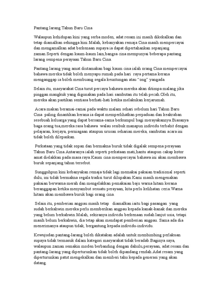 Pantang larang merupakan kepercayaan masyarakat melayu berkaitan dengan adat dan budaya warisan nenek moyang kita dahulu. Pantang larang tahun baru cina. Hidup dalam masyarakat berbilang kaum dan agama, rakyat malaysia mempunyai pelbagai jenis kepercayaan yang datang daripada tinggalan nenek moyang atau ajaran agama. Pantang larang tahun baru cina. 2) kalau pinggan mangkuk yang digunakan pada hari perayaan tahun baru cina pecah.