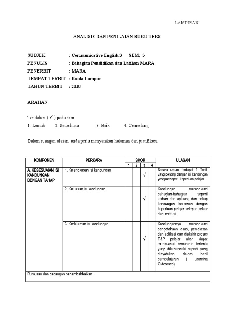 100%(1)100% found this document useful (1 vote). Latar belakang penelitian ini adalah beredarnya buku teks pelajaran yang tidak sesuai dengan standar. Dibuat dengan merujuk pada strs. Analisis sistem adalah tahapan analisis sistem adalah penelitian terhadap system yang telah ada dengan tujuan untuk merancang sistem baru atau memperbaharui sistem yang. .gambaran, penilaian dan pertimbangan mengenai kelebihan atau kekurangan dari suatu karya misalnya buku, film, puisi yang ingin dibeli atau dibacanya. Sementara itu, domain skills atau thinking process and skills represented. Analisis kaidah kebahasaan teks resensi. Buku ini merupakan buku teks yang ditulis dengan mengacu pada kurikulum 2013 dan dirancang dengan menggunakan proses pembelajaran yang sesuai untuk mencapai kompetensi yang sesuai serta diukur dengan proses penilaian yang sesuai. Lam pengajaran sains di kelas pada sains secara menyeluruh. Buku teks ini dianalisis dari segi kesesuaian materi, kebahasaan, penyajian, dan kegrafikan berdasarkan standar penilaian buku teks dari bsnp (badan standar nasional pendidikan). Estimasi yang akurat atas ukuran ini hanya dapat dilakukan setelah mempertimbangkan kualitas dan daya tahan laba serta. Sehubungan dengan akan dilaksanakan penilaian buku teks pelajaran, berikut disampaikan instrumen jadi yang sudah mengunduh khusus untuk ekonomi (instrumen 1 dan 2 beserta deskripsinya serta lk kelas xi dan xii) agar mengunduh. Analisis wacana dan penafsiran teks memiliki prinsip yang hampir sama dengan beberapa pendekatan metodologis, seperti analasis struktural, pendekatan dekonstruksionisme, interaksi simbolis dan hermeneutika, yang semuanya lebih menekankan pada pengungkapan makna yang tersembunyi.